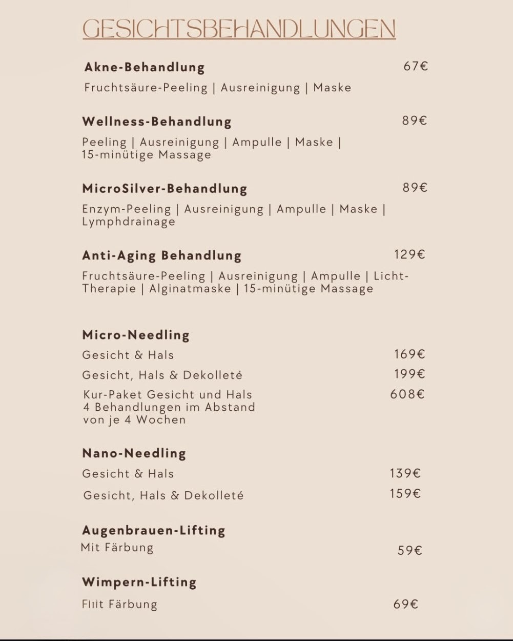 Angeboten werden unter anderem Gesichtsbehandlungen, Deep Cleansing, Dermaplaning, Microneedling, Maniküre, Pediküre, Brow Lifting, Lash Lifting, Waxing sowie Permanent Make-up. Damit deckt das Studio sowohl klassische Kosmetikbehandlungen als auch spezialisiertere Anwendungen ab.